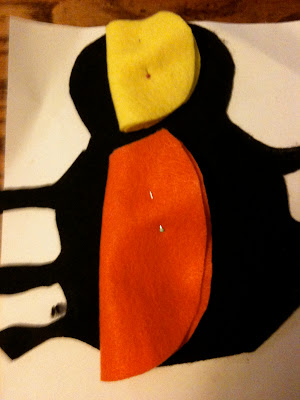 For the body of the costume I made a jumpsuit out of orange fabric, there's a slit in the back and two ties to hold it together. Yellow fabric was added for the belly. The hat is the same orange fabric made into a bonnet hat with ties.